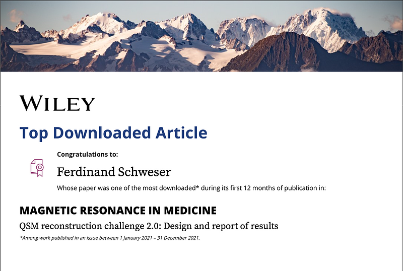 Our paper "QSM reconstruction challenge 2.0: Design and report of results" is one of the most downloaded papers during its first 12 months of publication in Magnetic Resonance in Medicine (among work published in an issue between January 1, 2011 and December 31, 2011).